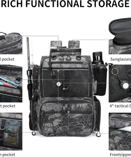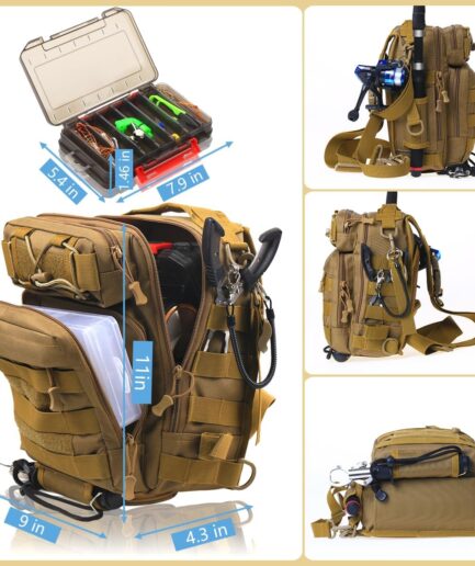 Fishing Backpack with Rod Holder, Water-Resistant Multi-Pocket Shoulder & Crossbody Storage Bag, Ideal for Saltwater & Freshwater Fishing, Hiking, Camping