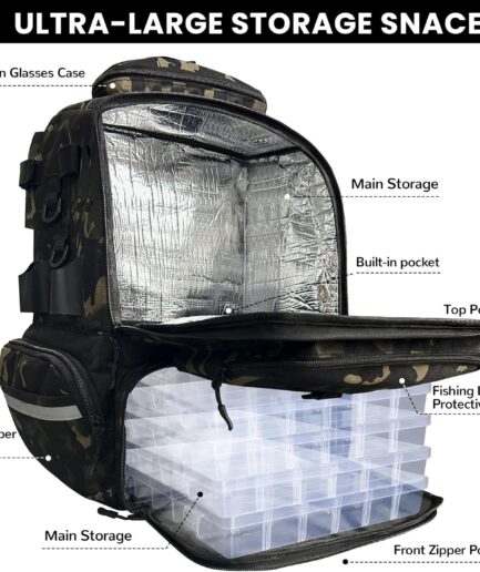 Fishing Tackle Backpack 58L Large Water-Resistant Fish Tackle Bag with Rod Holders Internal insulation compartment Storage Bag Store Fishing Gear for Hiking Travel and Hunting